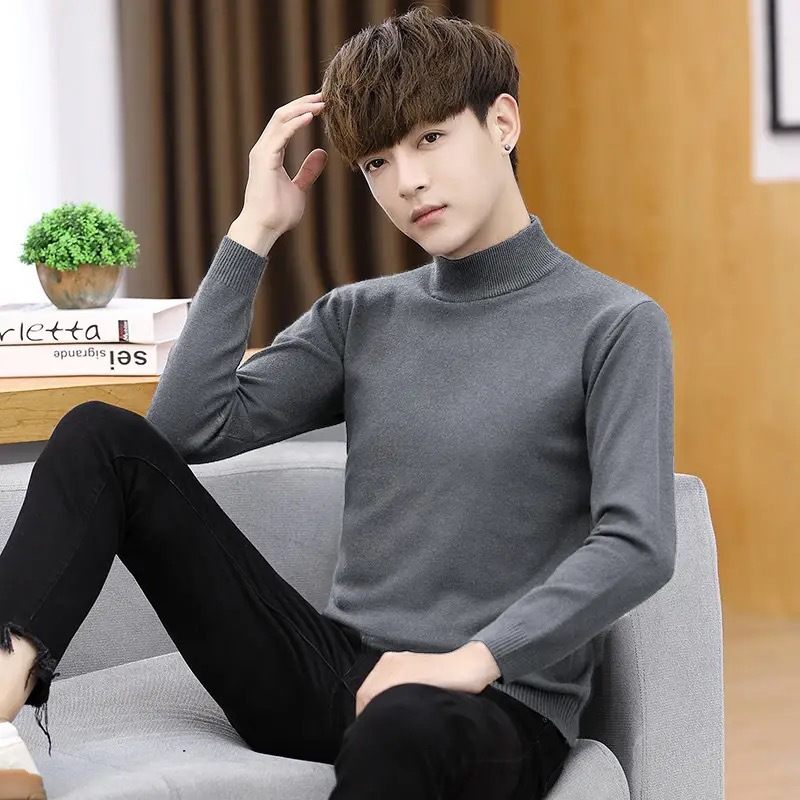 Men's Sweater Half-turtleneck Autumn and Winter Slim-fit All-match Knitted Base Shirt Pure Black Mid-collar Fashionable Sweater